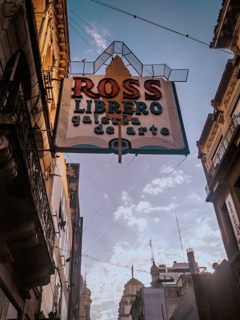 Vintage bookstore signage with an artistic facade in downtown Rosario, Argentina.